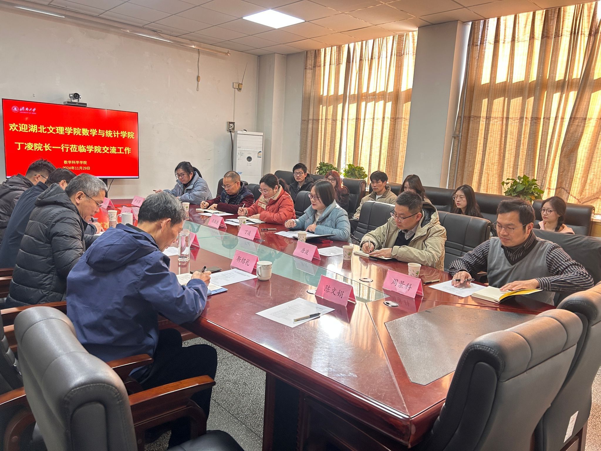11月29日,湖北文理学院数学与统计学院院长丁凌、副院长唐波、张敏捷等一行来院考察交流。学院院长孙元功、副院长王洪凯、靳绍礼热情接待并参加交流座谈,座谈会由院长孙元功主持。