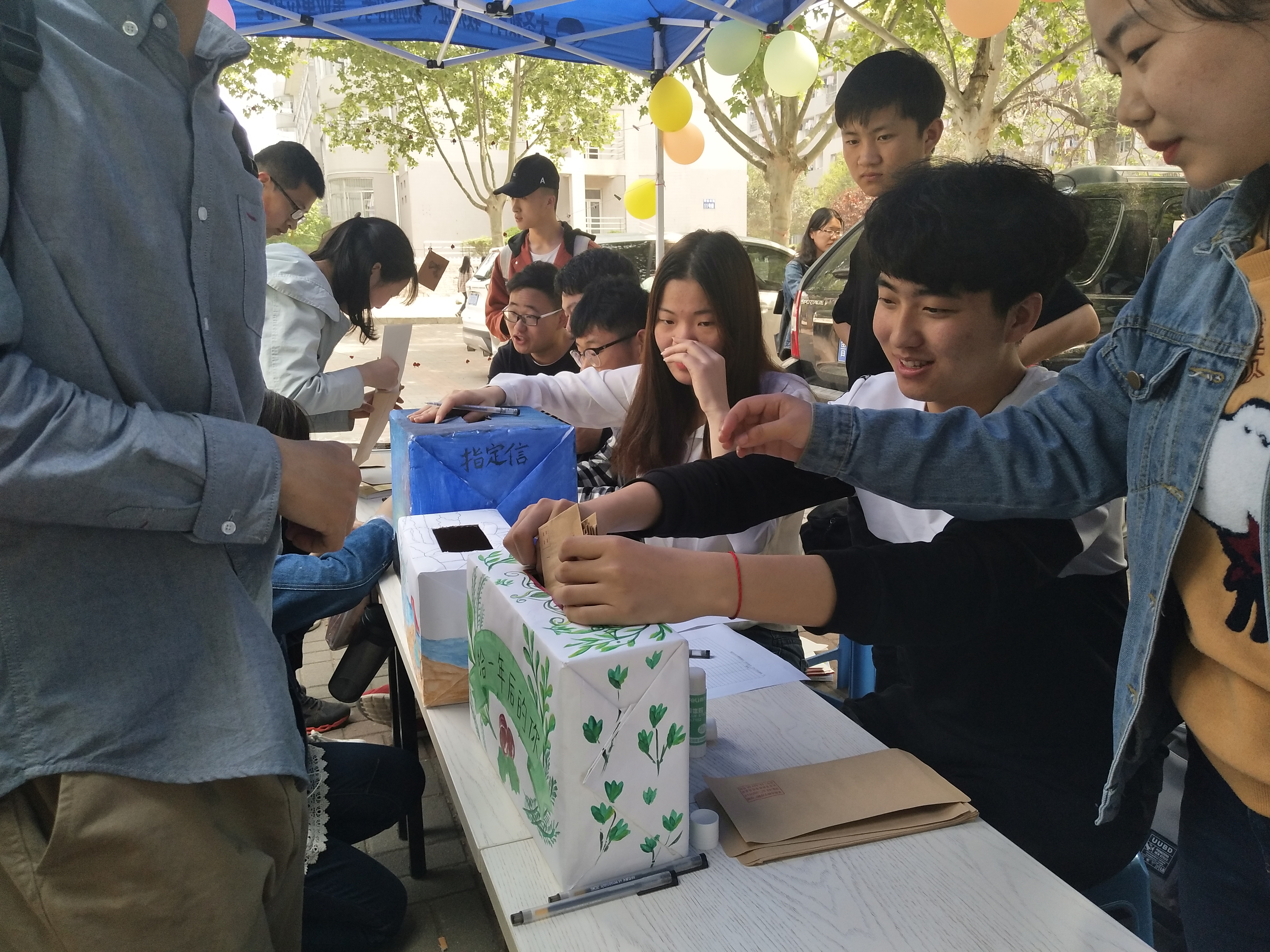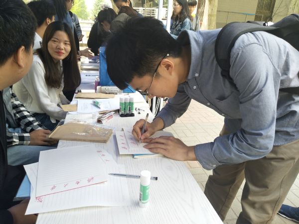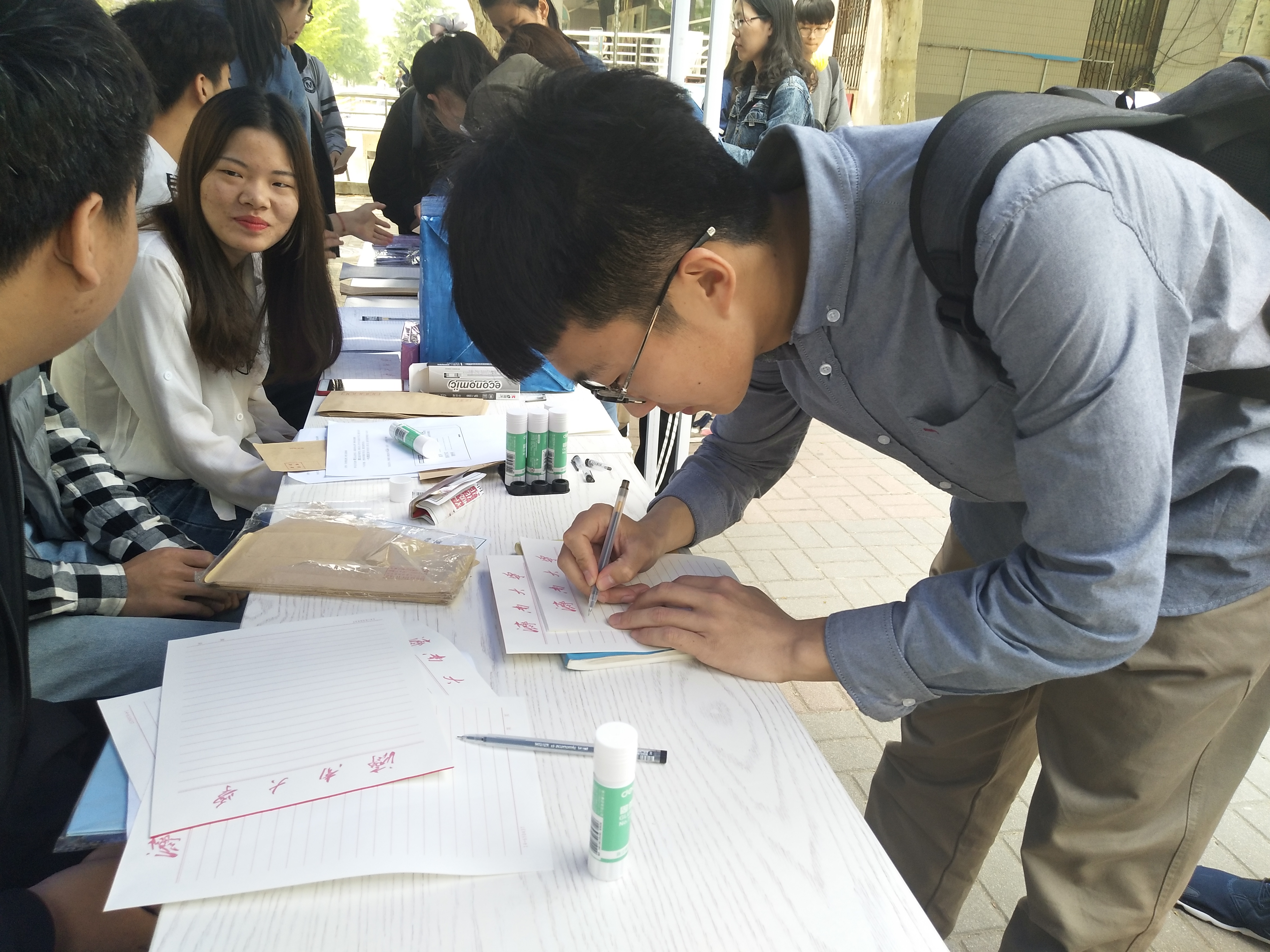 上午,心理志愿者协会的干事们提前到达八食广场为活动做准备。大家分工明确,有人负责分发信纸,胶水,有人负责介绍书信格式,有人负责收集同学们写好的信封。干事们为参与活动的同学准备了精美的礼品与信纸。同学们下课后,活动现场人来人往,大家积极的参与活动,炎热的天气并不能减少同学们的热情,他们认真的在精美的信纸上写下一行行字,有对自己未来的美好展望,有对同学的嘉许赞美,有对朋友的真诚祝福……时间过得飞快,随着一叠叠信封被投入信箱,人群渐渐散去后,干事们仔细地整理好信件,收拾好活动器材,活动结束。