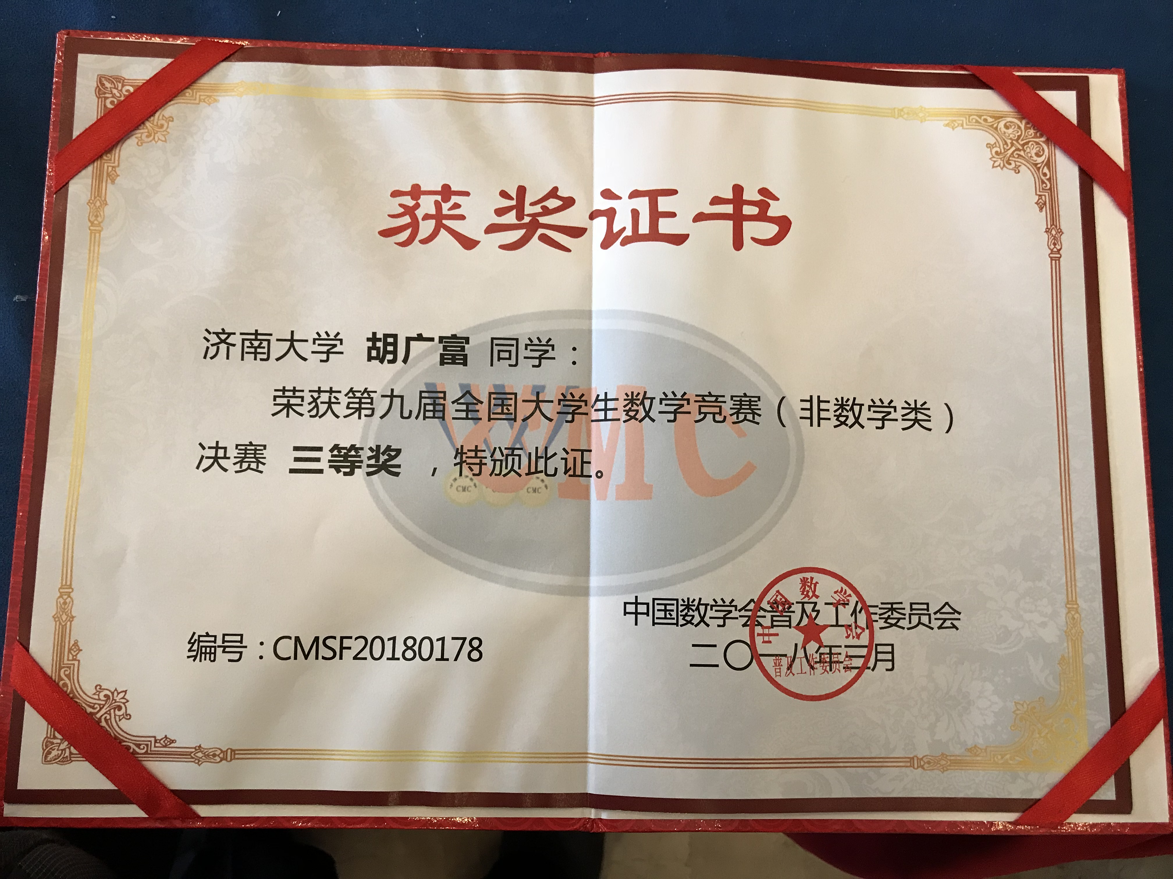 3月24日、25日,第九届全国大学生数学竞赛决赛在西安交通大学圆满落幕。我校自动化与电气工程学院学生电气1506班胡广富同学获得全国非数学类决赛三等奖。