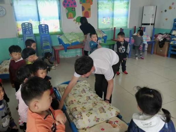 志愿者到达时,小朋友们正在午休,在耐心等待小朋友起床后,大家开始分工志愿任务,每人负责一个班,大家为小朋友叠被子,搬桌椅,安排上课。并陪小朋友做游戏,在看到小朋友们的一个个笑脸后,志愿者们顿时觉得自己的爱心得到了充分的回报。之后,志愿者为小朋友们读了故事书,一个个充满童趣的故事,使小朋友们陶醉在故事情节中,也拉近了志愿者和小朋友们的距离。课间,大家为小朋友们分发了水杯,并组织小朋友喝水。下午3点,志愿活动结束。