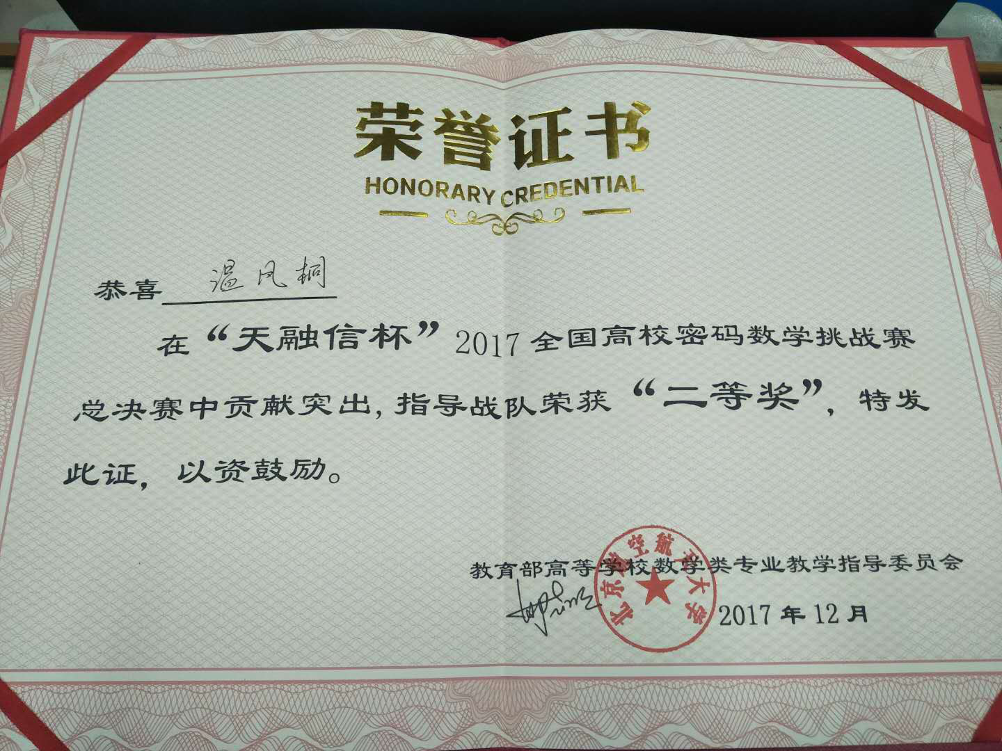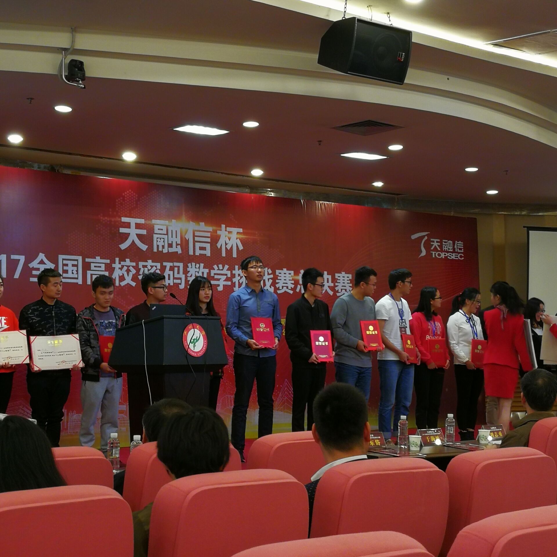12月3日天融信杯2017年全国高校密码数学挑战赛总决赛颁奖典礼在广州大学隆重召开。我校英国365集团大三学生任金波、杨莫难组成的代表队与全国各地著名高校研究生队伍同台竞技,喜获总决赛二等奖,该队由数学院温凤桐老师指导。