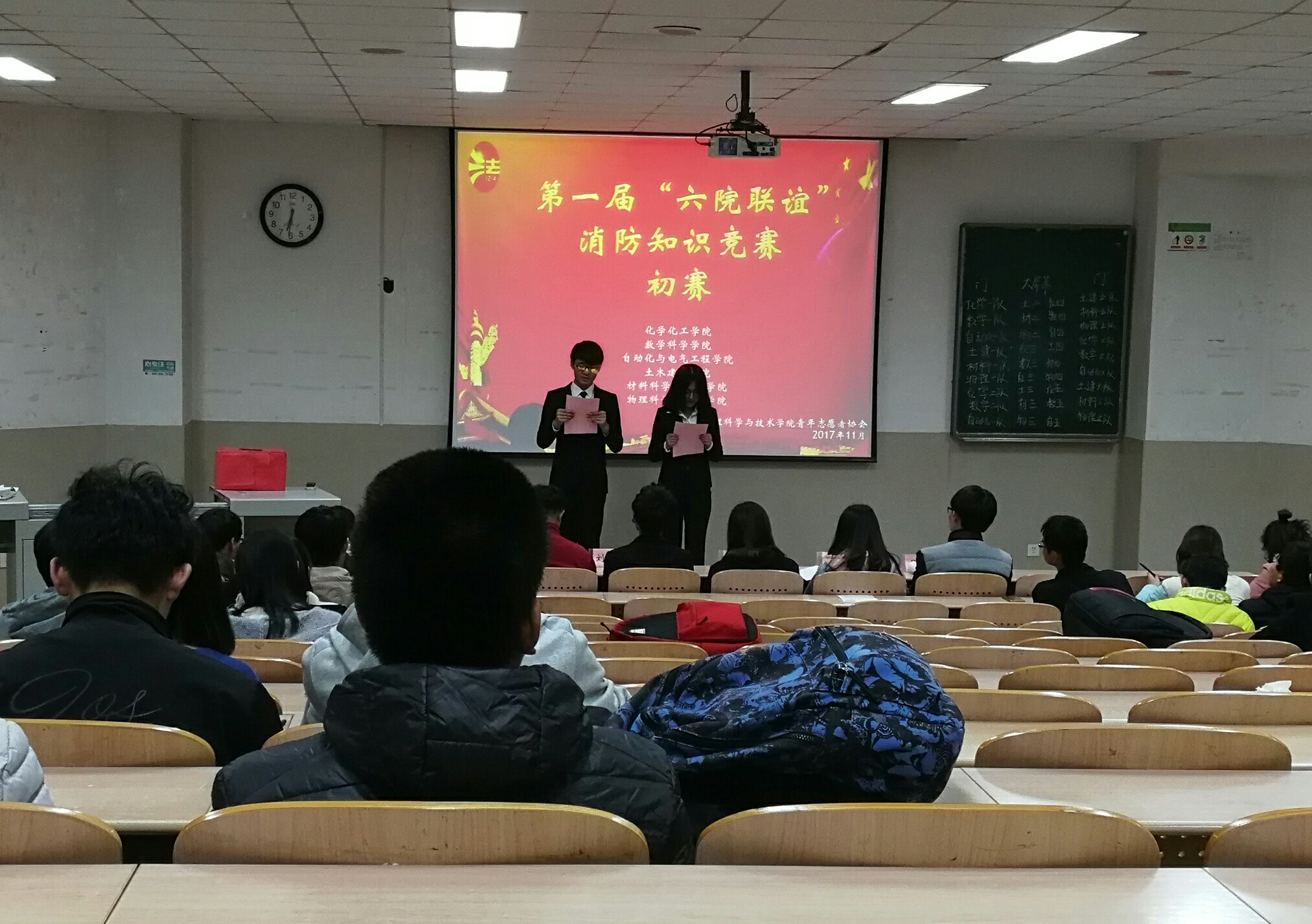 为了增强同学们的消防安全意识和自防、自救、自我逃生的能力,切实加强消防安全管理, 有效地预防火灾,英国365集团于11月10日晚在英国上市公司官网36511教参加了由英国上市公司官网365校志愿者联合会组织的第一届“六院联谊”消防知识竞赛。到场的有各院理事、青年志愿者协会部长以及参赛学生代表。