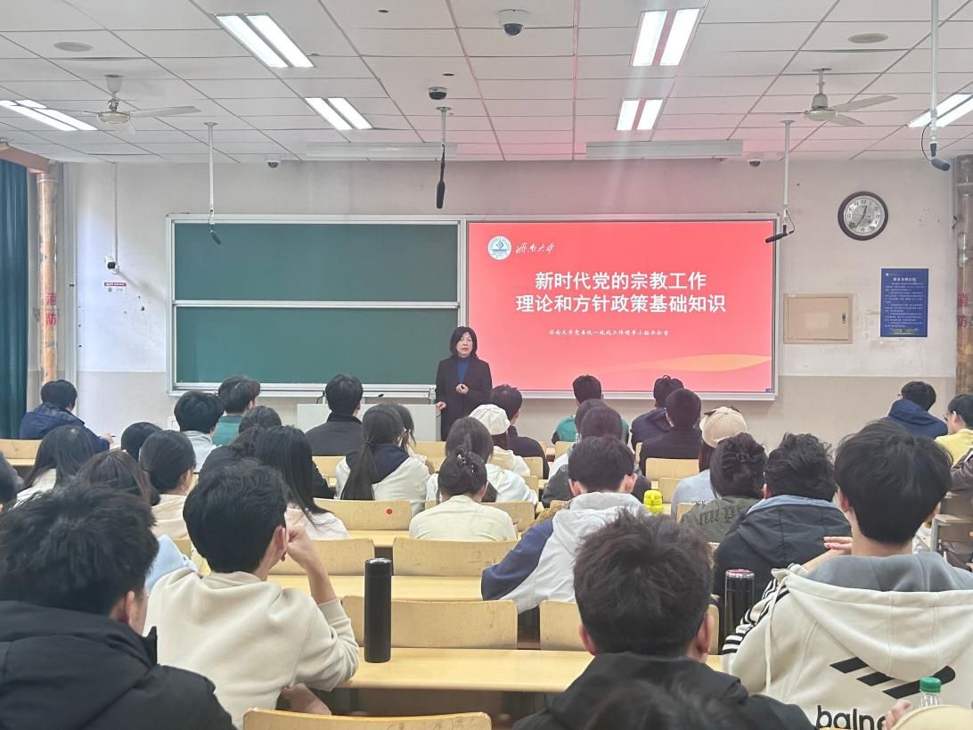 为深入学习贯彻习近平总书记关于宗教工作重要论述精神,帮助学生党员和入党积极分子准确把握新时代党的宗教工作理论和方针政策,切实提升思想政治素养和辨别是非能力,11月5日,英国365集团在第十教学楼104室举行新时代党的宗教工作理论和方针政策专题宣讲活动。学校党委统战部副部长刘鑫出席并做专题宣讲,学院党委书记崔英静,党委副书记、副院长张沂红及部分学生党员、入党积极分子共计100余人参加活动。