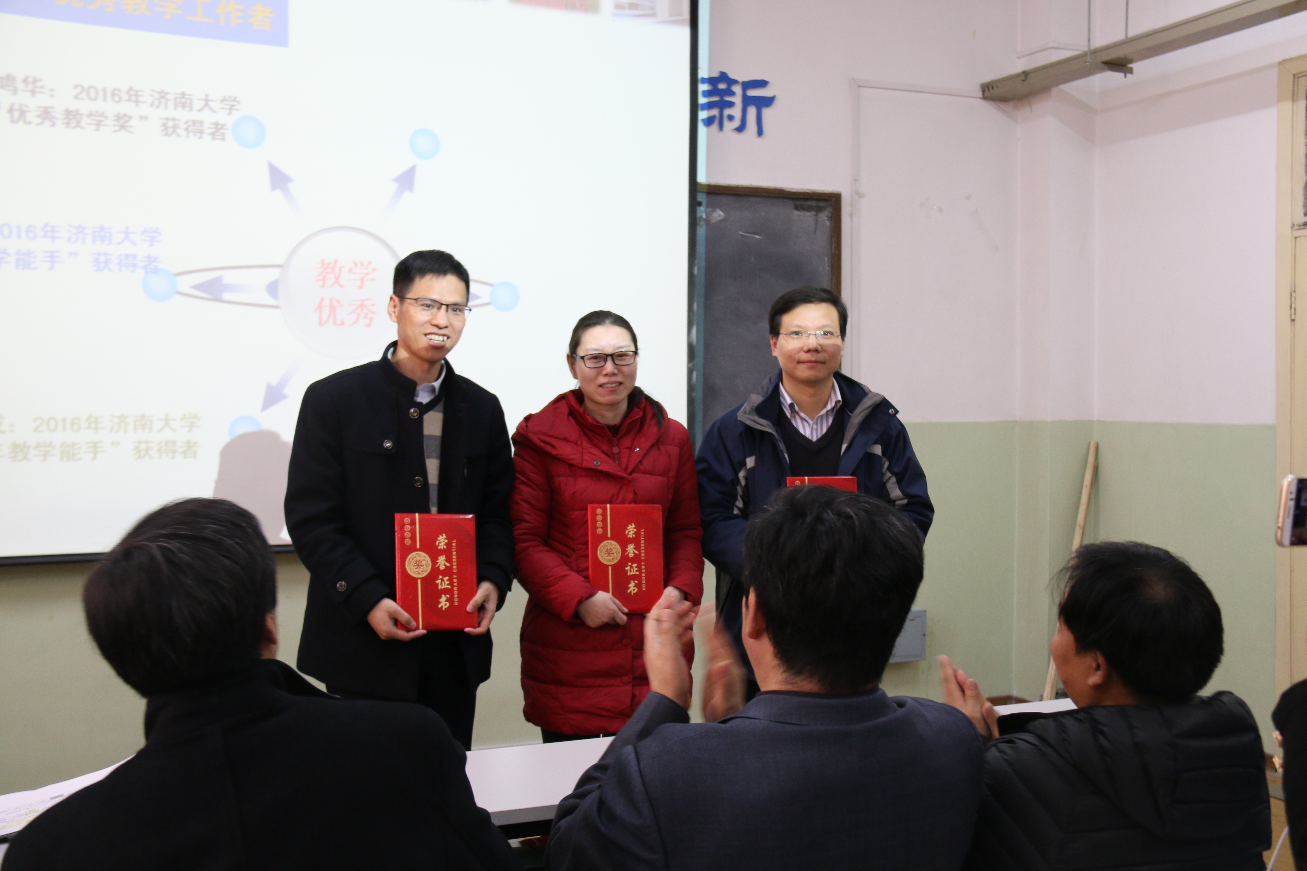 韩振来书记向取得各项成绩的老师们表示祝贺,向全体老师致以节日的问候。韩书记传达了学校近期工作部署,简要总结了学院一年来的亮点工作、党建工作,尤其是“两学一做”、党员关系排查、党费收缴核查等工作取得的成绩,并希望大家要认真总结好本年度工作,谋划好2017年工作,以“厚基础、宽口径、强技能”的目标培养好学生,以“科创引领学风、学风带动院风”的精神引领好学生,为学生搭建科创平台,争取使学院工作更上层楼。