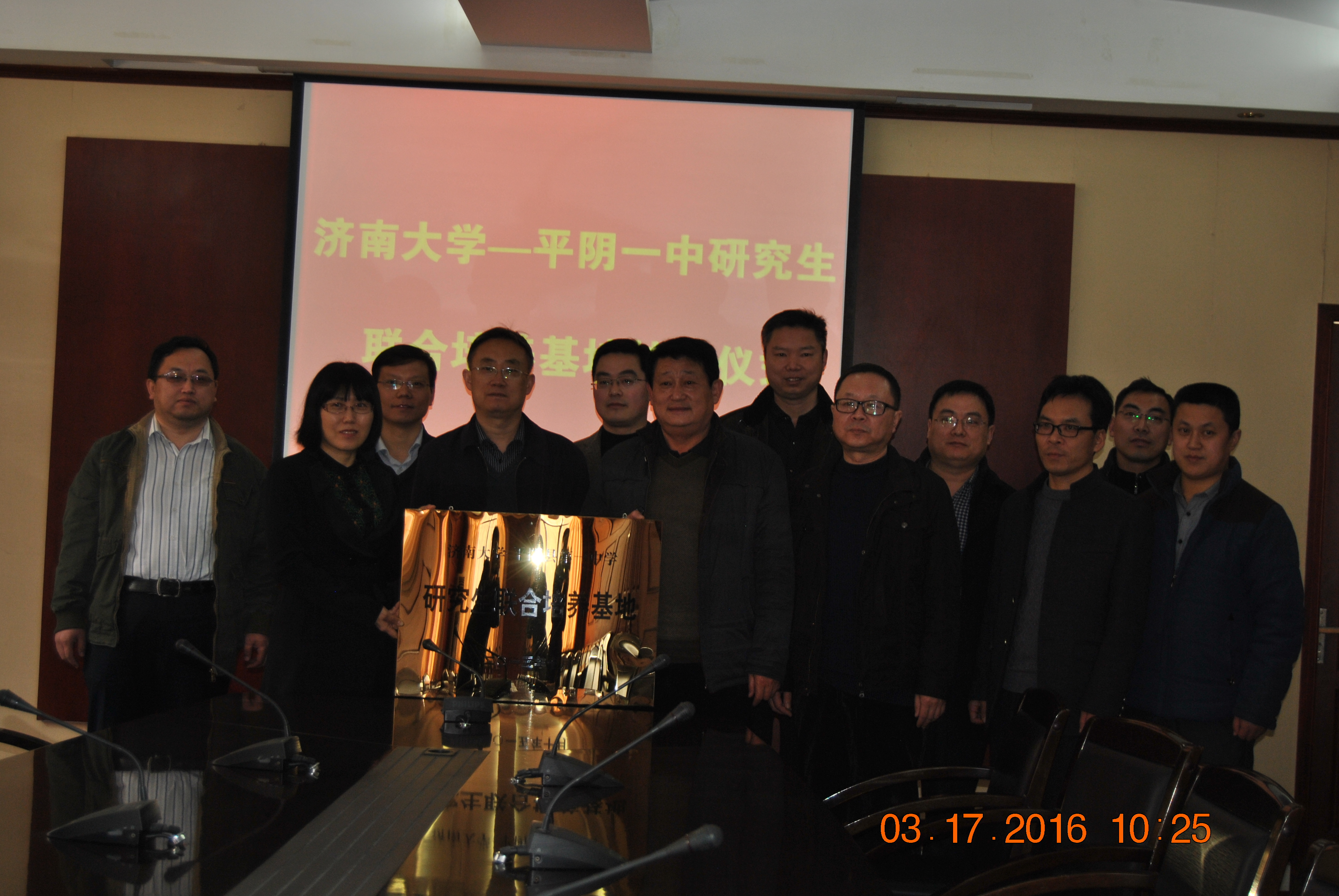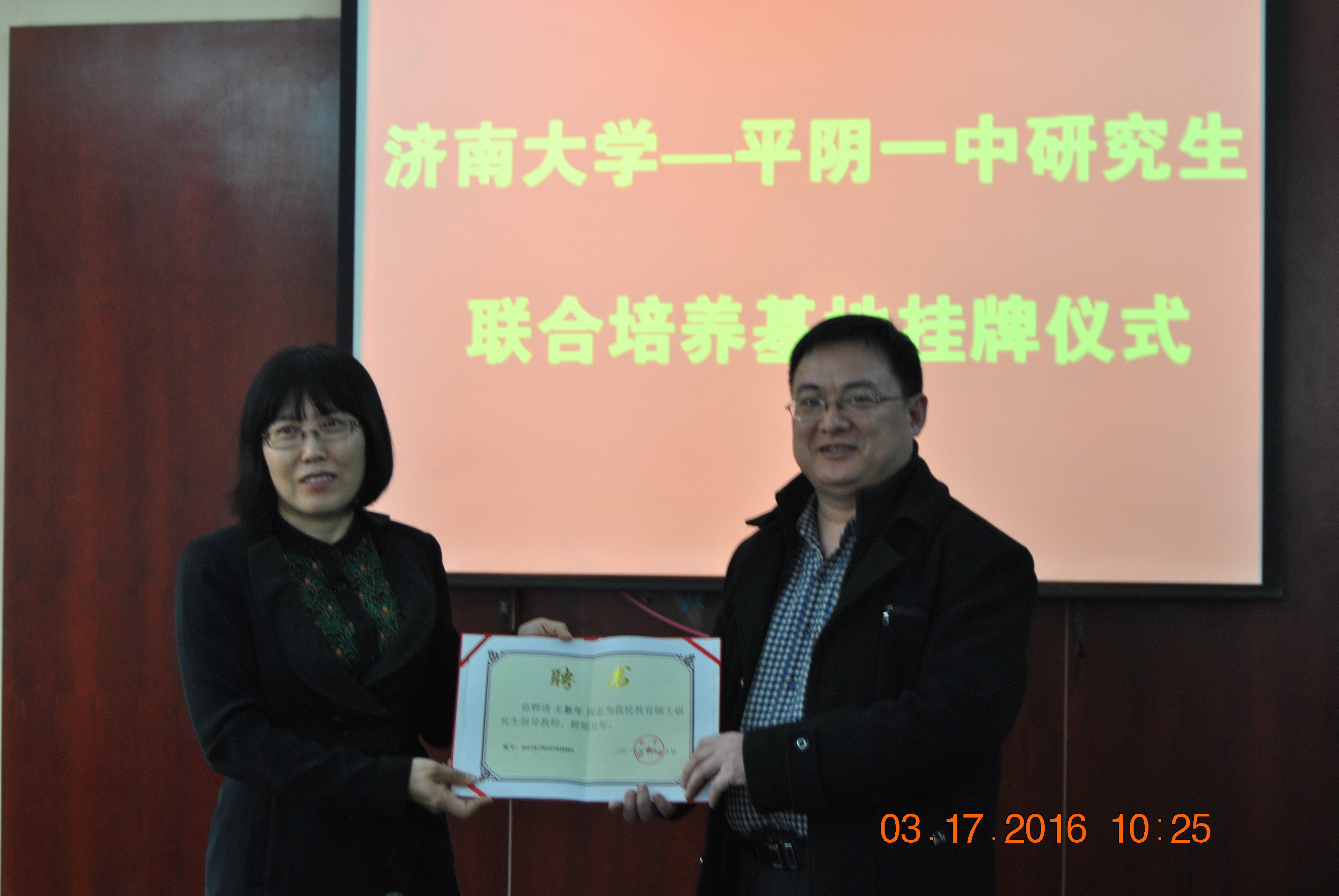 2016年3月17日上午,英国上市公司官网365---平阴一中校外研究生联合培养基地揭牌仪式暨英国上市公司官网365校外研究生导师聘任仪式在山东省平阴县第一中学举行。平阴一中校长杨会忠,副校长贾勇,教导主任赵海军,数学教研室主任解西文等相关领导老师,我校研究生院副院长原雪梅,英国365集团院长管延勇,副院长王洪凯,数学教育教研中心主任李可峰,张超等老师参加了本次活动。管延勇院长,原雪梅副院长与平阴一中的杨会忠校长共同为培养基地揭牌,原雪梅副院长为平阴一中王新年老师颁发了英国上市公司官网365教育硕士校外研究生导师的聘任证书。