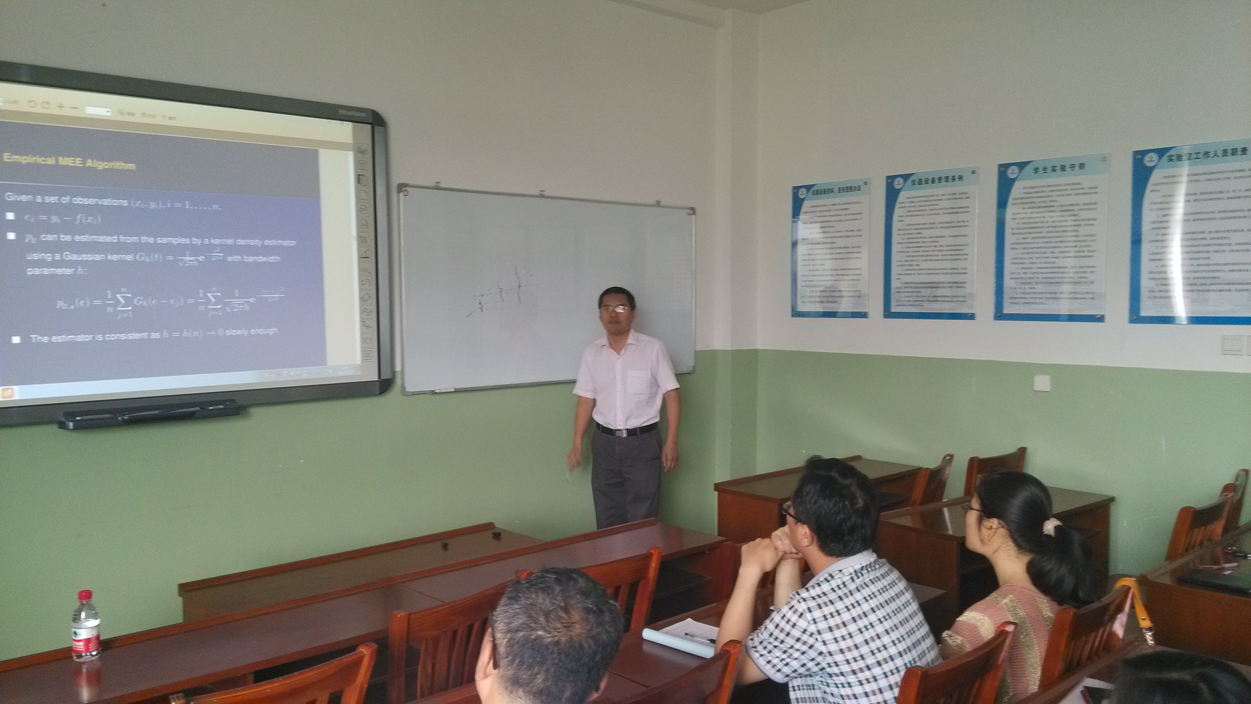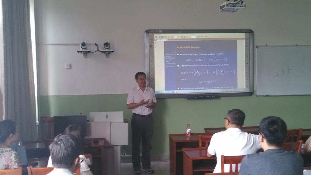 吴强博士的报告题目为《Consistency Analysis of the Minimum Error Entropy Algorithm》。报告中,吴强博士详细介绍了回归学习、基于信息论中Shannon熵与Renyi熵的MEE回归算法的由来、以及MEE回归算法的一致性分析,并提出了进一步思考的一些问题。会后,英国365集团不确性数学理论科研团队的师生们还就学习理论的一些前沿问题和国外研究现状与吴强博士进行了探讨和交流。