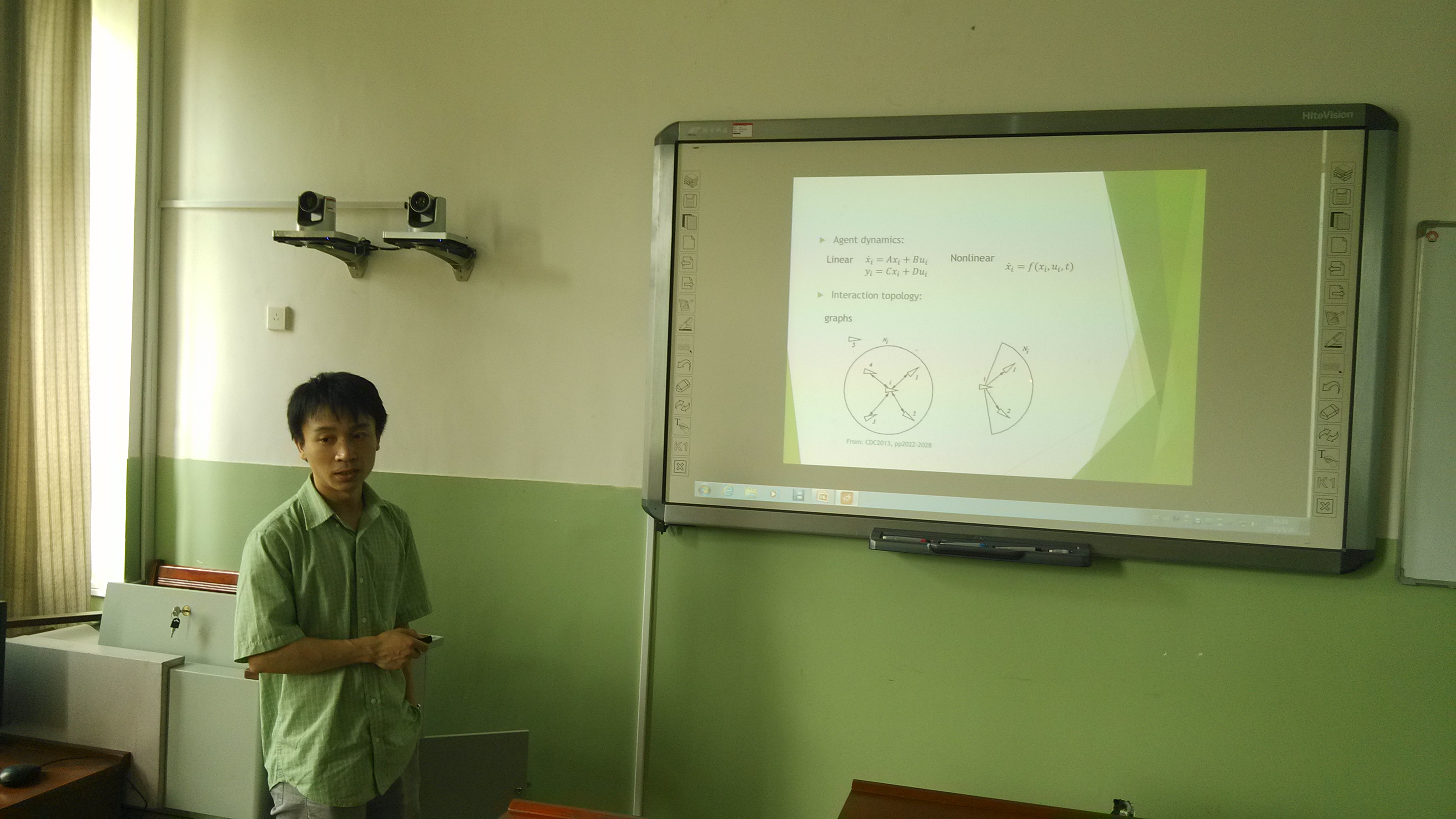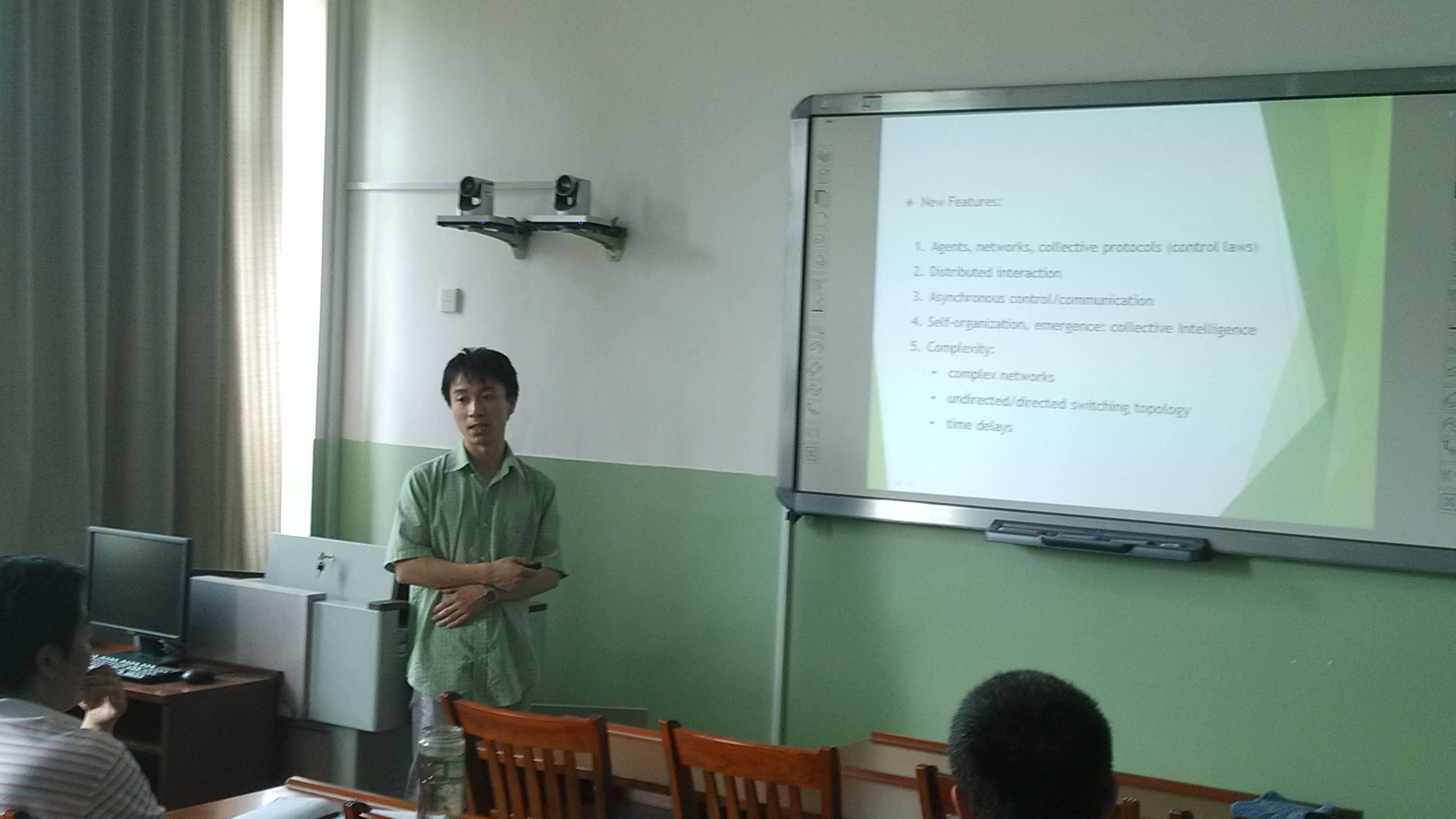 报告会上,肖峰教授从多智能体系统的工程背景入手,介绍了多智能体系统分布式协同控制的相关概念和发展概况,提出了多智能体系统基于边异步数据采样的一致性问题,详细阐明了解决该问题的主要思想和研究思路,并提出了进一步研究的科学问题。会后,复杂系统分析与控制团队的师生们还就报告中的相关问题和多智能体系统的国内外研究现状和趋势与肖峰教授进行了探讨和交流。