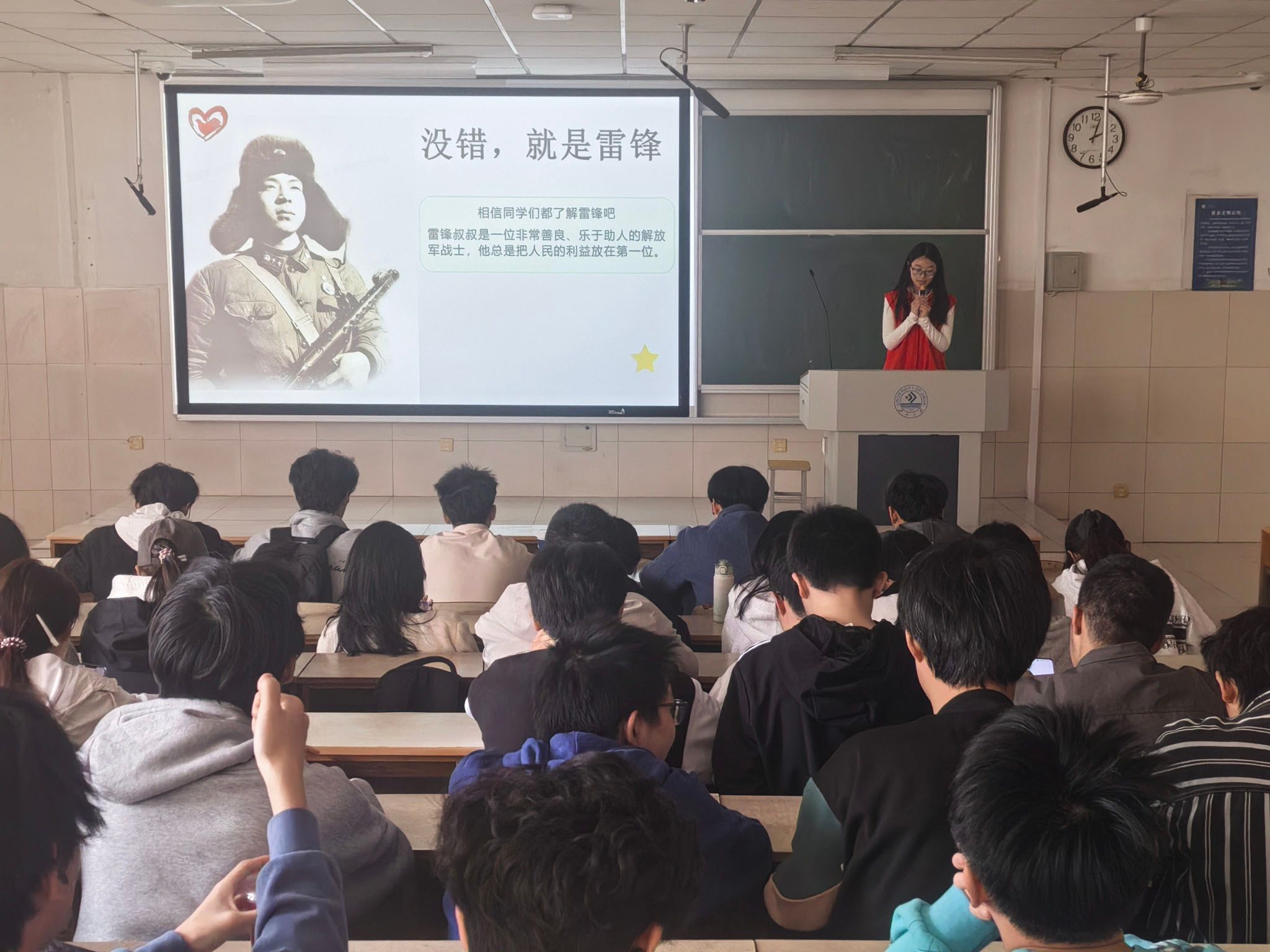 宣讲人马兰惠围绕雷锋精神的时代内涵与垃圾分类的现实意义展开讲解。通过生动的案例分析和互动问答,同学们深刻理解雷锋精神中“服务人民、助人为乐”的核心价值,同时掌握垃圾分类的基本知识与规范操作。宣讲过程中,大家认真聆听、积极发言,展现出浓厚的学习热情。