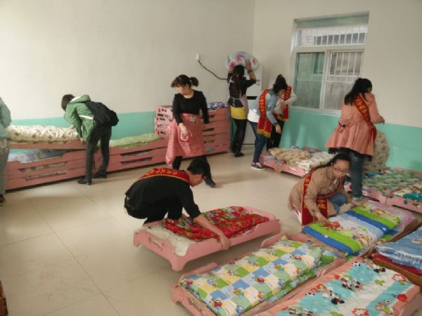 下午两点,青协的同学们怀揣着期待与激动,步入魏华村幼儿园。同学们首先走进孩子们睡觉的小屋,看到一张张临时床有序的摆在地上,他们两两一组,先将小床内的被褥整理平坦,后将所有的小床搬到墙的一侧。虽是简单的工作,但他们仍以最认真的态度对待。每一次细心的铺伸,每一个坚定的曲躬,都表现出他们对孩子们的关心与呵护。随后,青协成员分成三组,分别教孩子们折“爱心”,并借此机会与孩子们进行面对面的沟通。孩子们欢天喜地的笑声,让青协成员们感到无比欣慰。他们教给孩子的不仅是折叠这一张张白纸,更是这一颗颗感恩友爱的心。四点,青协成员与孩子们道别,孩子们不舍的目光与青协的留恋交织在一起,为这次活动划上圆满的句号。