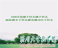 或许现在的我们由于来自父母、社会和周围环境的压力越来越多,感觉自己已经没有自由,而我眼中的自由更多的是精神上的自由。虽然生活节奏越来越快,但我们依然可以给自己一个悠闲的午后,为自己其一杯茶,贪婪的享受阳光的沐浴;依然可以在劳累了一天之后尽情的在操场上奔跑,释放所有;依然可以和朋友哈哈大笑不顾所有。在我们睡觉之前清空大脑里的烦恼,让温馨的梦乡走近你,让大脑里的每个细胞自由畅想;给自己的心一片净土,这就是自由!