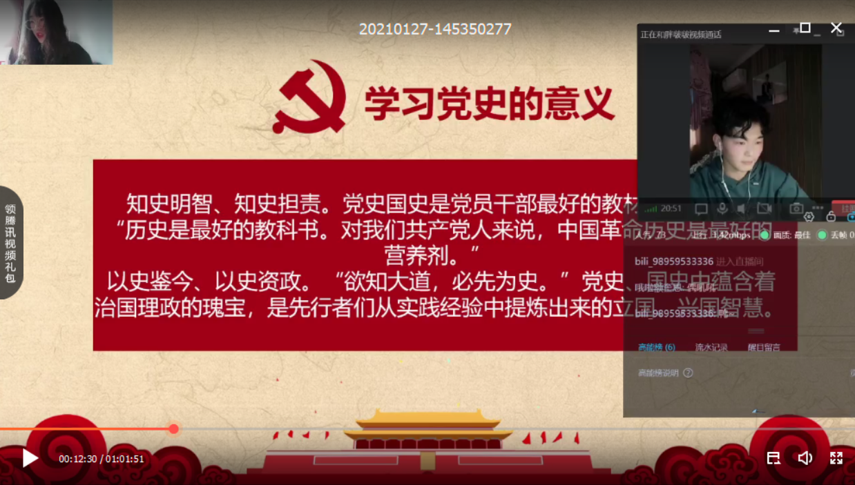 为了保证直播活动的顺利进行,保证此次活动的质量,王彦博与王嘉润两位同学在前期做了一系列准备。两位同学以图片和小视频的形式展示ppt来讲解。讲解内容从党史和新中国史两个大部分分别展开。直播首先由王彦博同学开始有关党史的讲解,从学习党史的意义为出发点,一步步引出了如何学习党史等一系列内容,让同学们充分认识到了没有共产党就没有新中国,只有中国共产党才是中国特色社会主义事业的坚强领导核心。在活动的后半段王嘉润同学讲述了新中国史,以土地改革、抗美援朝、社会主义制度的确立等事件为线索,充分展现了从建国到新时代,我们的国家是如何一步步由弱变强的伟大历程。通过两位同学的讲解,让我们深切地感受到这来之不易的幸福生活,以及老一辈革命党人的坚定信念和决心。