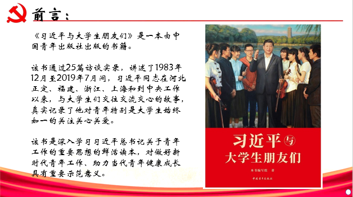 为了保证此次活动能够顺利完成,李蕴璐和李思源两位同学在直播之前精心准备了ppt并在正式直播之前多次练习讲解。讲解内容从25篇访谈实录一一展开。直播首先由李蕴璐同学开始讲解,她先以“立志高远,多读书,多到基层磨炼”为基调,向我们阐述了年轻一代要结合中国的特点把握自己的路。虽然每个人的成长方式不同,但基层的经历和实践绝对是人最美好的财富的核心思想。在活动的后半段李思源同学讲述了我们当代大学生要贯彻“真学,真懂,真信,真用”的主题思想,告诉同学们要潜心学习,志存高远同时也要脚踏实地打牢知识基础提高综合素质。通过两位同学的讲解,我们感受到了习近平总书记对当代大学生的勉励和期盼,身为当代大学生的我们想必也不会辜负习近平总书记对我们的希望,定会树立起理想的风帆,努力练好人生和事业的基本功,做有担当,有作为的大学生。