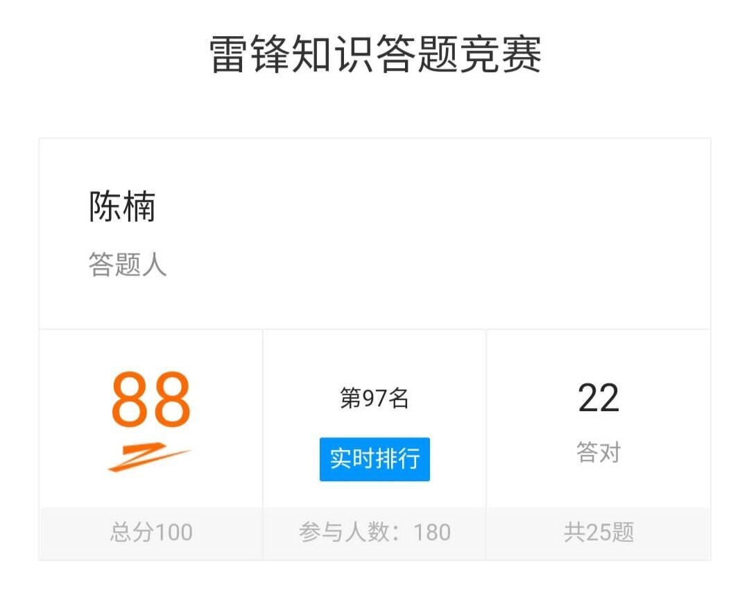 同学们在防疫的同时积极参与此次活动,纷纷加入竞赛群进行答题。他们通过查找资料,与群内成员交流的形式来学习雷锋知识,增加对雷锋的了解。青年志愿者协会收集各类关于雷锋的知识,设置了选择题、填空题、简答题三种形式,在雷锋的生平、事迹、名言、优秀品质等方面为同学们出题,内容丰富。青年志愿者利用答题平台对同学们的答案进行校对,检验同学们的学习成果,并将结果反馈给同学们。答题平台也给出了明确的分数,让同学们清楚自己的不足之处,从而使学生更加准确地掌握雷锋知识。