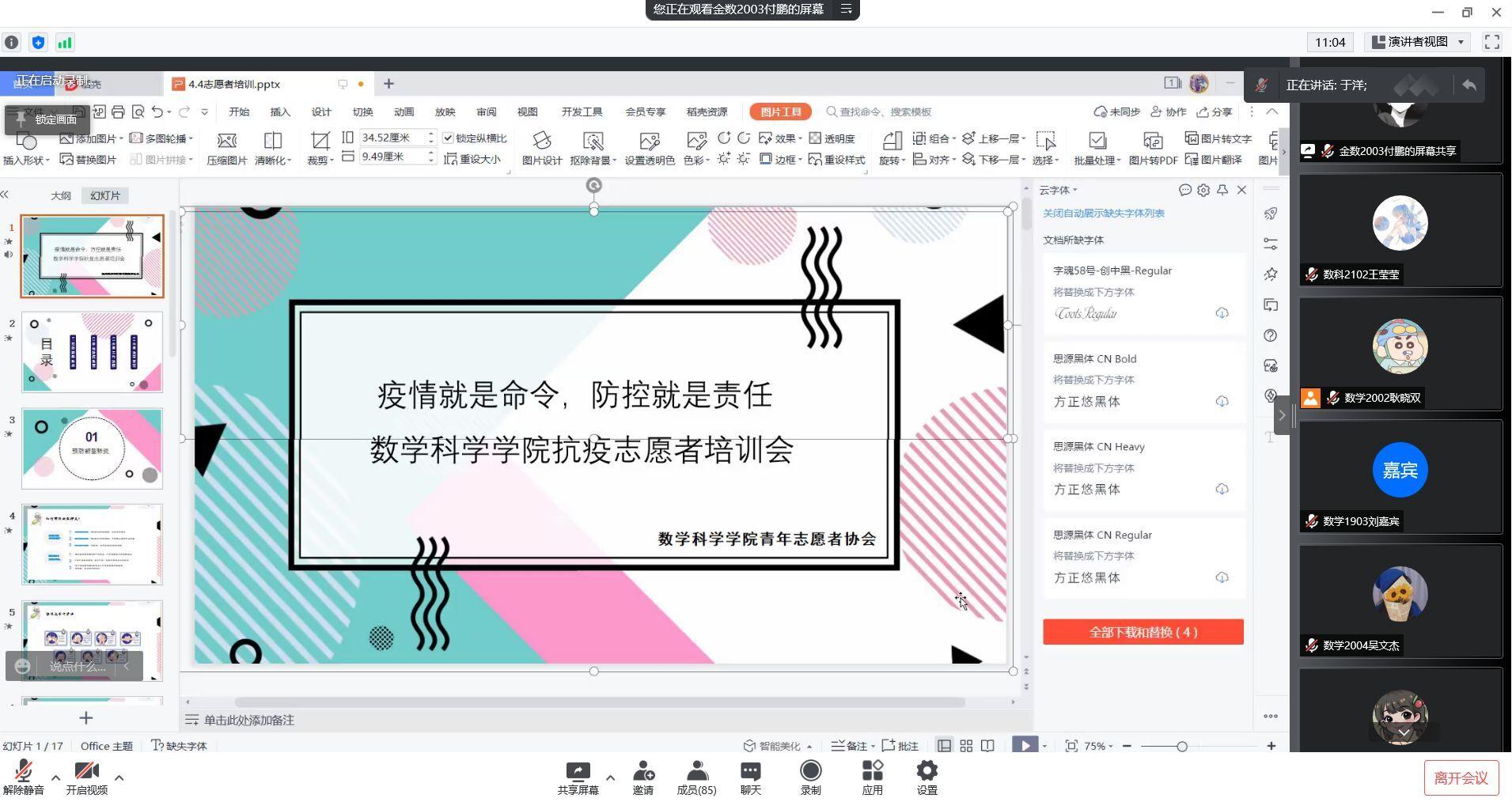 秉持“疫情就是命令,防控就是责任”的原则,团委书记于洋老师结合当前学校疫情防控形势,详细解读了疫情防控常态化管理下,全面落实志愿者防控策略的必要性,鼓励大家团结一致,共同抗疫。随后付鹏同学对志愿者进行技能培训,详细介绍了志愿者在值班时的个人防护措施以及注意事项,强调如何处理在服务过程中出现的几类突发情况,以及志愿服务中应该具备的“三种”沟通能力。最后,付鹏同学向大家讲解了最近的工作安排,包括食堂落座扫码,核酸抽测场地秩序维持以及其他学校疫情防控志愿工作。志愿者们都打起十二分精神,时刻准备好为抗疫志愿服务中贡献出自己的力量。