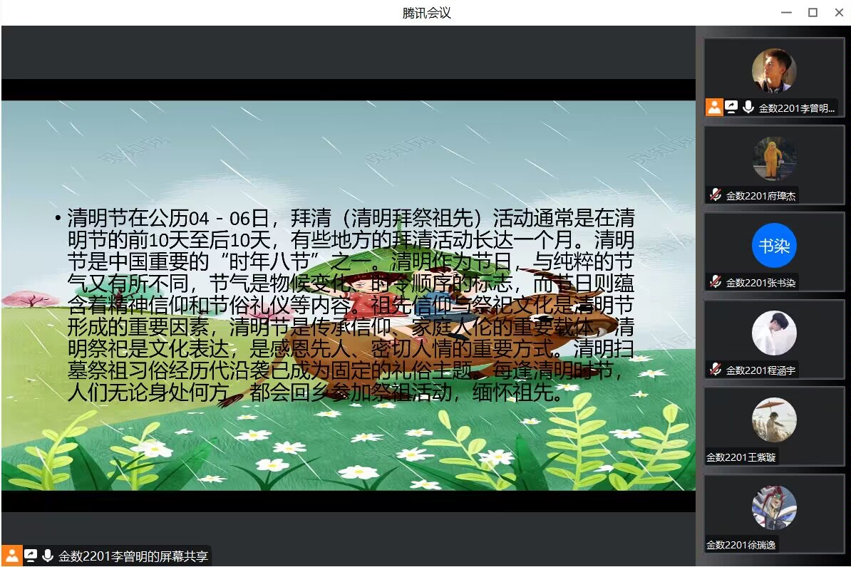 “忠魂不泯,浩气长存”,那些为了中国的独立富强而抛头颅,洒热血的英雄烈士永远活在每一个中华儿女的心中。英国365集团清明节主题班会的成功开展,不仅加强了同学们对中国传统节日的认识,还激发了同学们对革命烈士的崇敬与怀念之情,更加坚定了数院学子拼搏奋斗,决心报国的伟大志向。