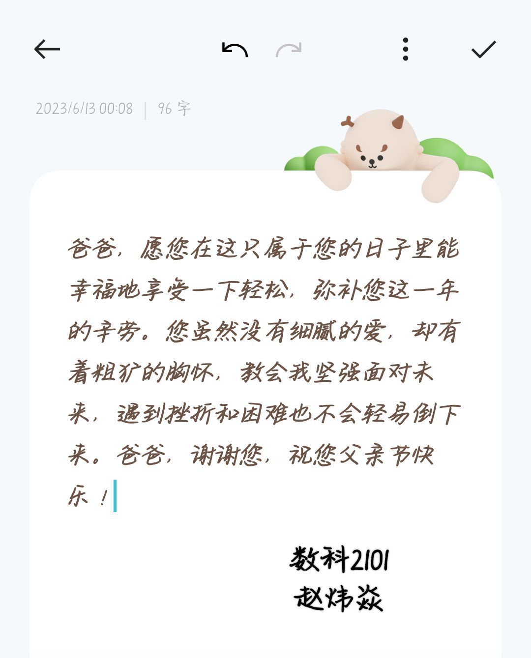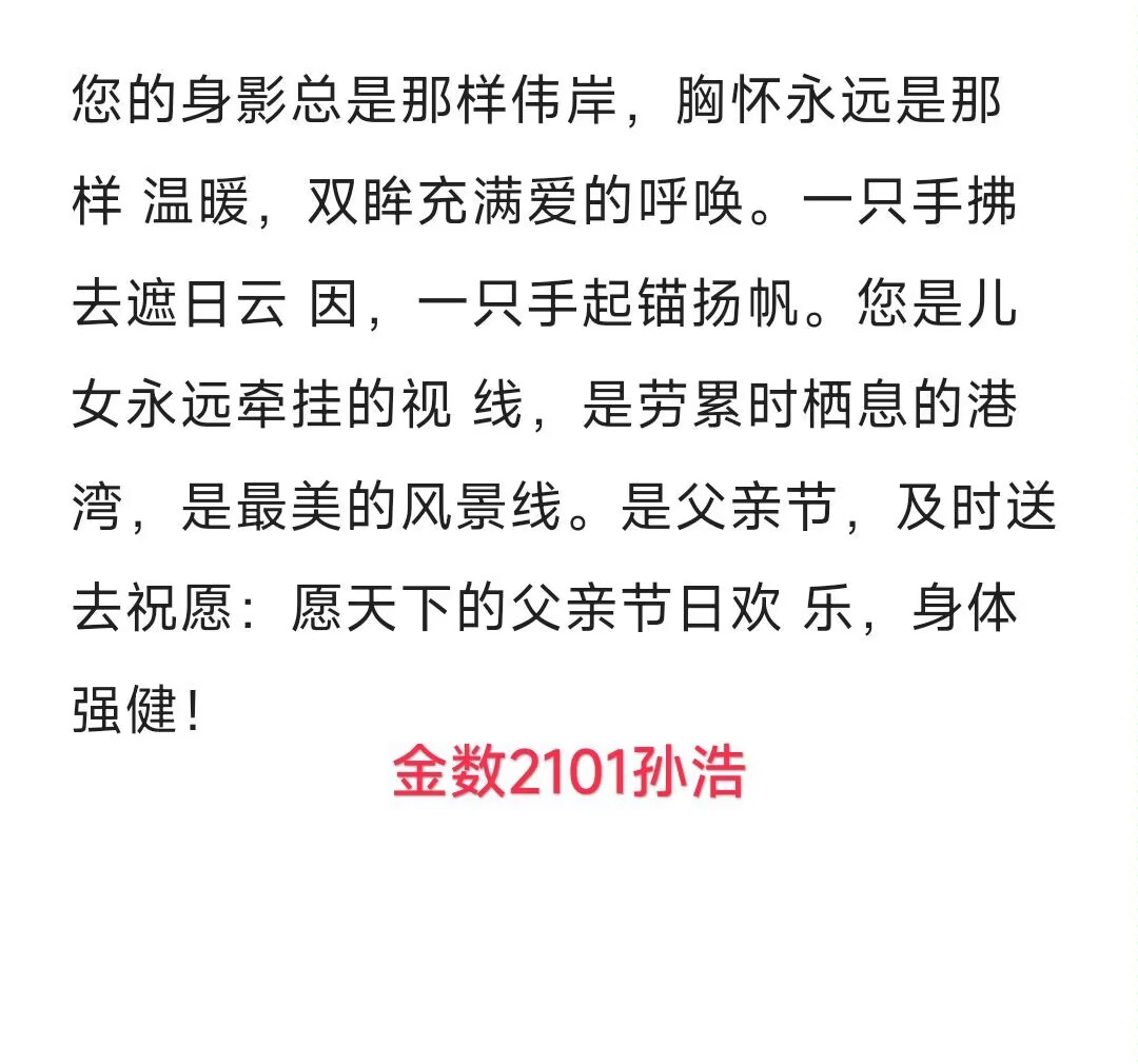 父爱虽无声,却滚烫,似骄阳,如明灯,还含糖。回应父爱的方式有很多种,或精心准备一份感人的礼物,给父亲一个惊喜,或做一份可口美味又满含心意的大餐,让父亲开怀大笑,感受亲情的温暖。这些看似简单的小事情,其实对父亲来说,意义非凡。因为这让他感受到,家庭的凝聚力,子女的关心与爱。学院学生为父亲送上一封封感恩的信,一句动人话语,一次视频通话,回应父爱,感恩父亲。“父亲给了我一片蓝天,给了我一方沃土,父亲是我生命里永远的太阳,希望父亲永远开心。”寄语声声,爱意绵绵。
