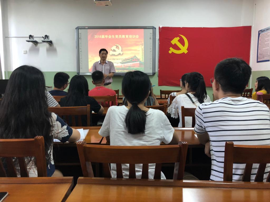 教育培训会由四个环节组成。首先,由韩书记带领毕业生党员重温入党誓词,同学们对着党旗,再次许下了铮铮誓言。之后,韩书记就同学们的毕业后发展方向,在校期间的党员素质培养,牢记习总书记教诲等三方面进行授课,并带领大家深入学习了习总书记在北京大学师生座谈会上的讲话。最后,韩书记用习总书记的话进行总结,并为同学们提出了四点要求:立国,立志,求真,立行。之后,孟书记就毕业生党员注意事项进行授课,他对毕业生党员应尽的义务,应承担的责任进行了深入剖析,并鼓励同学们踏实走好脚下的路。最后,由赵华磊老师组织开展主题党日教育:感恩母校,文明离校。她要求同学们在文明离校过程中发挥党员榜样示范作用,在走向社会后,继续秉承“弘毅 博学 求真 至善”的校训,为党旗添彩,为母校增光。